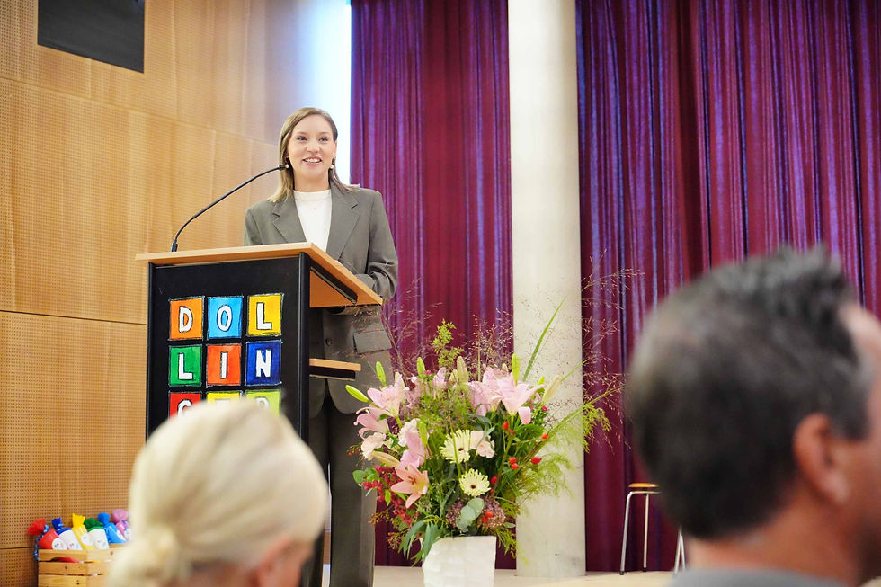 Die Schulleitung verabschiedete den Jahrgang auf besonders originelle Weise: Marcus Pfab, Marcus Selg und Edeltraud Klöss hatten sich wie jedes Jahr mehr einfallen lassen als eine klassische Rede – in Form einer fiktiven Nachrichtensendung wurde über „Breaking News von der Dolli“ berichtet. Neben einem unterhaltsamen Rückblick auf sechs Schuljahre standen auch die herausragenden Leistungen im Mittelpunkt: 43 Belobigungen, 28 Preise und 9 naturwissenschaftliche Auszeichnungen sprechen für sich.