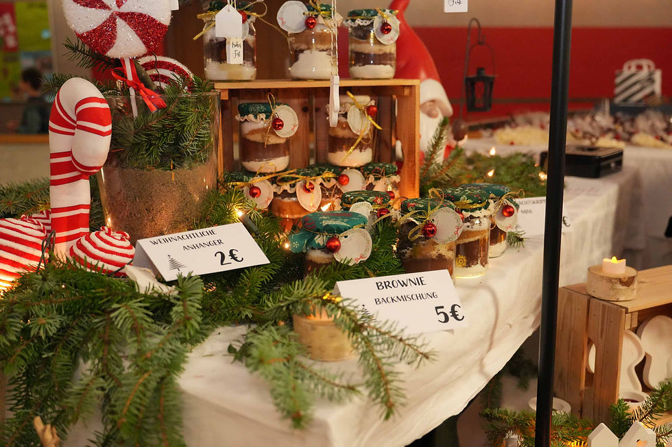Auf mehreren Etagen boten Schülerinnen und Schüler sowie Eltern mit großem Einsatz Selbstgemachtes an: Marmeladen, Weihnachtsgebäck, Holz- und Betonarbeiten, Dekorationen und kleine Geschenkideen. Internationale Spezialitäten, Flammkuchen, Waffeln und das „Dolli-Café“ sorgten für eine warme, einladende Atmosphäre. Für Kinder gab es Bastelangebote, Kinderschminken und eine Tombola.
